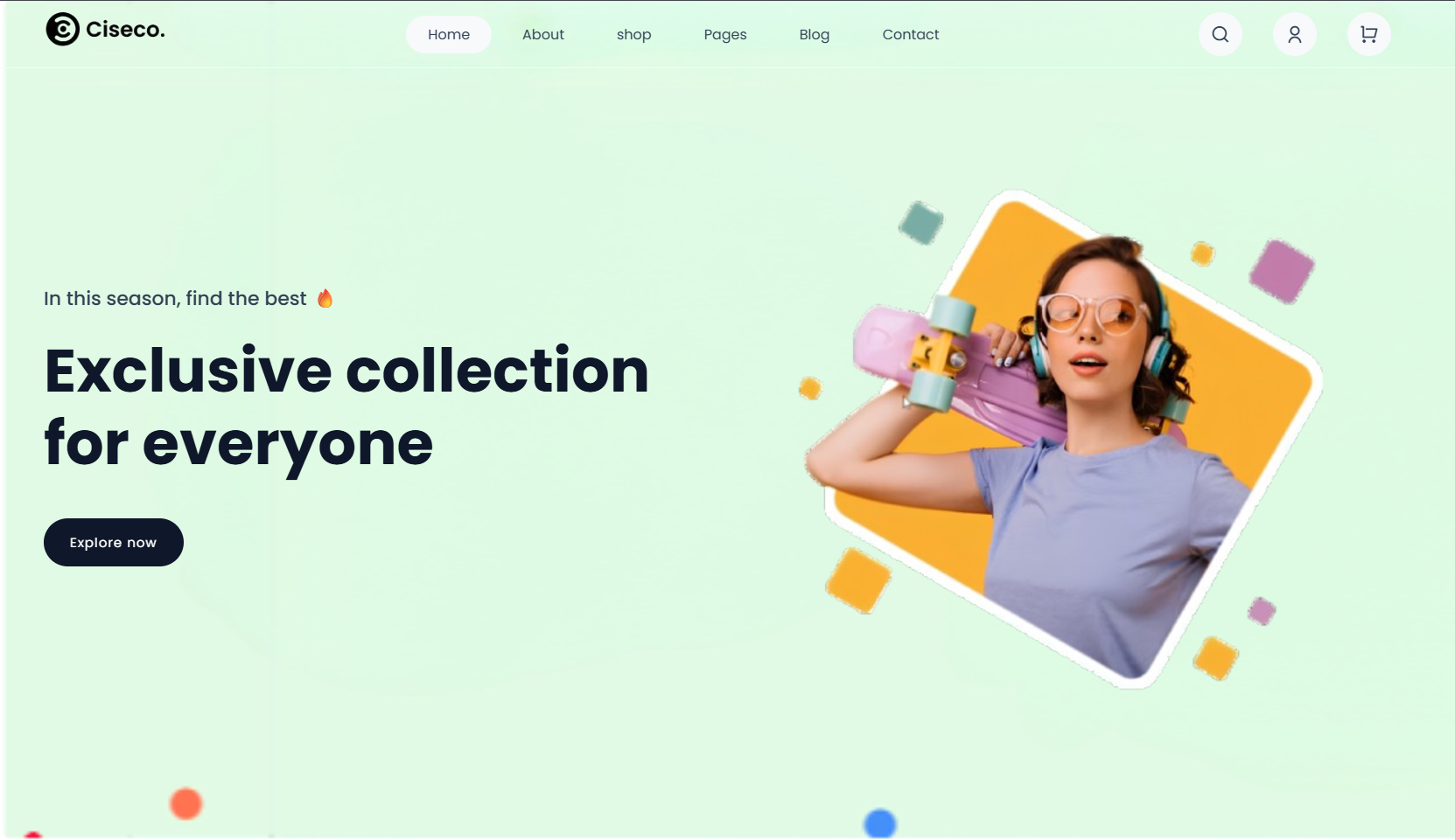 This is a modern e-commerce homepage featuring a clean, minimal design. It highlights an exclusive seasonal collection with a bold headline, a call-to-action button, and a vibrant hero image. The navigation bar is simple and clear, making it easy for users to explore products, pages, the blog, and contact options.